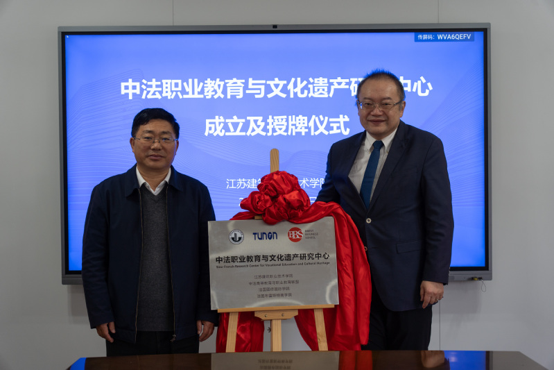 沈士德与沈岱共同签署合作共建方案,并为“中法职业教育与文化遗产研究中心”揭牌。同时,沈岱为艺术设计学院、经济管理学院授牌。