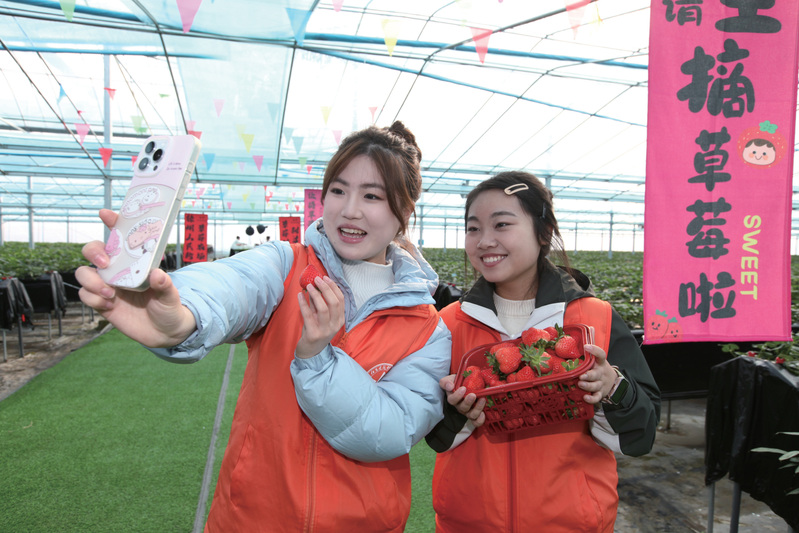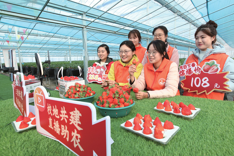 12月17日,江苏HJC黄金城技术学院经济管理学院电子商务专业的学生在徐州市铜山区三堡街道一农场直播销售草莓。近年来,该校与三堡街道开展校地共建,为大学生搭建社会实践平台,借助电商平台助力地方农产品销售。(蒯创 摄)